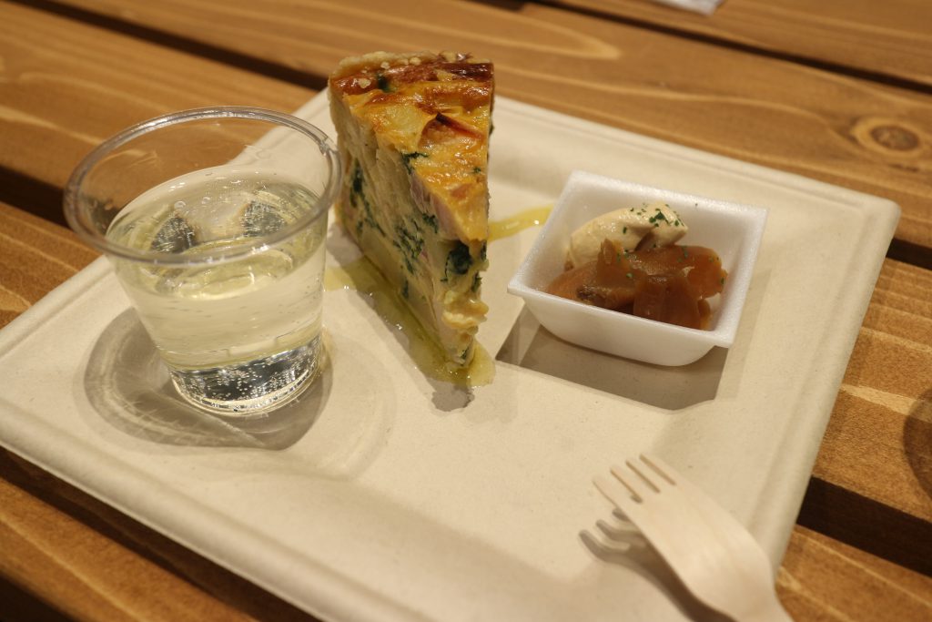 こちらは「ニューサイトウ」というお店のお酒&おつまみセット。キッシュとミョウガとクリームチーズです。